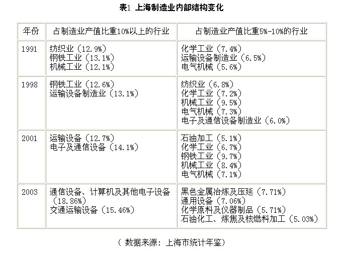 从上海1991年到2003年制造业内部行业的数据中,可以看到传统的化学纤维、纺织、橡胶制品、仪器仪表四大行业出现衰退和萎缩。如纺织业从1991年的12.9%下降到1998年的6.8%,2001年仅为5%以下(见表1)。