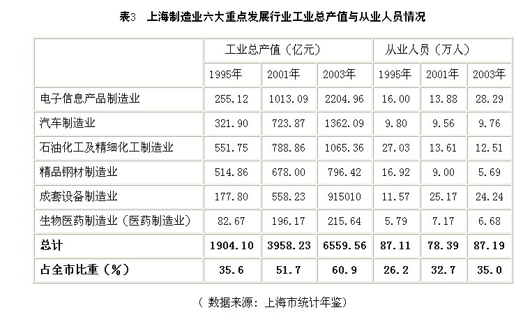 总量:2000年,上海制造业从业人员311.1万人,占全市从业人员总数的38.3%,到2003年,制造业从业人员减少到276.02万人,占全市从业人员总数的33.95%,比2000年下降了4.4个百分点。
