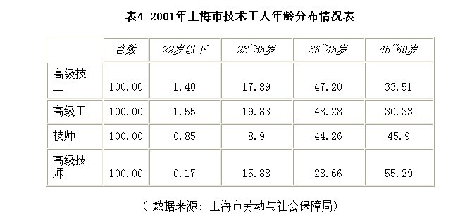 技能结构:2001年,上海技术工人总量为137万人,其中高级技工11.2万人,占技术工人总量的8.16%。高级技工中,本科学历占5.71%、大专占9.46%,高中、中专学历占47.93%,初中及以下占36.87%。高级技工总体以36-45岁为主,占47.20%,1/3人员年龄偏大,在46-60岁之间。其中高级工以36-45岁和46-60岁的中老年人为主,技师以46-60岁和36-45岁的老中年人为主,高级技师则是主要集中于46-60岁年龄段(见表4)。