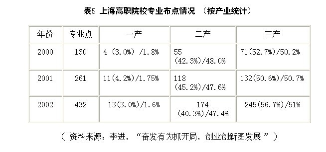 从专业设置的情况看,上海高职专业点每年递增幅度呈跨越式态势:2000年高职专业点130个,2001年增加到261个,2002年达432个。上海高职院校专业设置相对于三产比重分布较为合理,并且每年递增幅度呈跨越式态势,2000年一产类专业占3.0%,二产类专业占42.3%,三产类专业占54.7%。2002年一、二、三产类专业分别占3.0%、40.3% 、56.7%(见表5)。