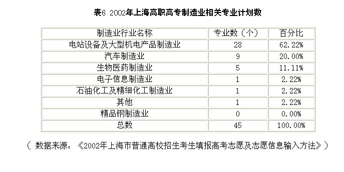 2002年,全市高职高专院校制造类专业点合计为88个,占高职高专院校开设专业总数的13.5%,其中2002年招生的专业点30个,实际招生的专业点比计划招生的专业点数减少了33%,与电站设备及大型机电产品制造行业以及汽车制造行业相关的专业占据了绝对地位,电子信息制造业、生物制药、石油化工、精细化工制造等方面的高职专业较少(见表6)。2004年,在上海市新批准设立的73个高职高专专业中,制造业类有6个,占新批准设立总数的8.2%。