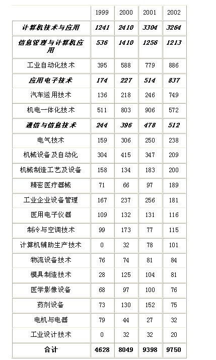 2002年,上海制造类与信息类高职招生数为9750人,比1999年增长了一倍多,占同年高职高专招生总人数的18.4%。其中专业代码为“IT”的“计算机技术与应用”、“信息管理与计算机应用”、“应用电子技术”、“通信与信息技术” 四个专业招生数占了总招生数的59.8%(见表7)。就制造类专业招生来讲,如图1所示,仅由1999年的2433人增加到2002年的3924人,增幅不大。在2002年招生的17个制造类专业(按专业代码分)中,招生数在100人以下的专业有6个,100~250人之间的专业有8个,只有“工业自动化技术”、“汽车运用技术”以及“机电一体化技术”三个专业的招生数超过了500人。