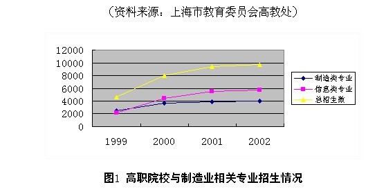 从近几年上海高职院校和中职学校的招生情况可以看出,上海的制造业人才培养数量与制造业需求还有很大的差距。2002年,上海制造类与信息类高职招生仅9750人,其中与六大重点发展行业密切相关的很多专业招生人数都低于100人,中职加工制造类专业招生仅为8244人,这与上海制造业发展对大量技术技能型人才的需求是不相适应的。