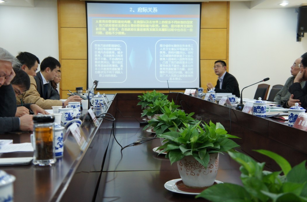 博士后开题会举行2013年院学术活动月活动之一——“教育现代化推进中的府际关系研究研讨会暨博士后开题会”于11月27日在我院举行。研讨会由副院长张珏主持。来自中国人民大学、浙江大学、苏州大学、华中科技大学及院内专家等10余人进行了研讨。 张珏副院长介绍了我院目前正在承担的“中国教育现代化指标体系研究”和“教育服务决策咨询系统”的进展情况。他指出,推进教育现代化发展,需要建立起地方和中央合力推进建设的机制,需要建立科学地目标任务分解机制、中央与地方的对等协商机制等,并要通过信息公开透明、公共财政体制改革等多种渠道来保证机制的良好运行。课题的研究过程是一个理论与实践相结合的过程,希望通过研究形成一种新的府际关系,对我国教育现代化的推进发挥一定的决策支持作用。 本次研讨会也是我院博士后工作站方建锋博士承担的博士后研究项目“教育现代化推进中的府际关系研究”的开题报告会。会上,方建锋博士汇报了研究方案和前期基础研究成果。对“教育现代化推进中的府际关系研究”中涉及到的政策执行、府际关系等核心概念进行了说明,并对国内外相关的研究进展情况、即将研究的府际关系视角下政策执行(教育现代化推进)现状分析、府际执行力的监测评价体系、我国推进教育现代化进程中的府际关系模式的设想、政府与社会互动落实的机制等重点研究领域等方面的情况做了说明。专家组认为,博士后选题围绕国家教育十二五规划的后续跟踪研究,对教育政策执行中的府际关系进行了系统梳理,集中探讨我国宏观教育政策执行中府际关系的职责和调适机制,有助于进一步提升教育政策研究的学理水准,为教育改革和宏观政策执行奠定较为坚实的理论基础,有助于为我国教育事业的稳步发展、扎实推进提供决策参考。专家组对课题研究如何进一步深入开展也提供了很多建议。 随后的专家主题发言中,中国人民大学教授、博士生导师,教育战略研究会秘书长周光礼作了题为《政策转化与政策执行:国家战略意图与大学组织应对》的主题报告,介绍了我国教育政策执行大背景下大学与中央政策之间的政策互动案例。 苏州大学特聘教授、博士生导师、公共管理一级学科带头人金太军作了题为《府际关系视野下的省管县改革》的主题报告,介绍了目前国家层面上正在推进的行政体制改革进展情况。 浙江大学教授、博士生导师、教育领导与政策研究所所长吴华作了题为《教育领域需要深化市场取向的改革吗?》的专题报告,介绍了市场因素影响教育领域中改革的各个表现。 华中科技大学教授、博士生导师陈廷柱作了题为《规划的性质与执行策略——基于二维象限分析的视角》的专题报告,对规划中的操作性方向性、限制性激励性因素进行了深入介绍。