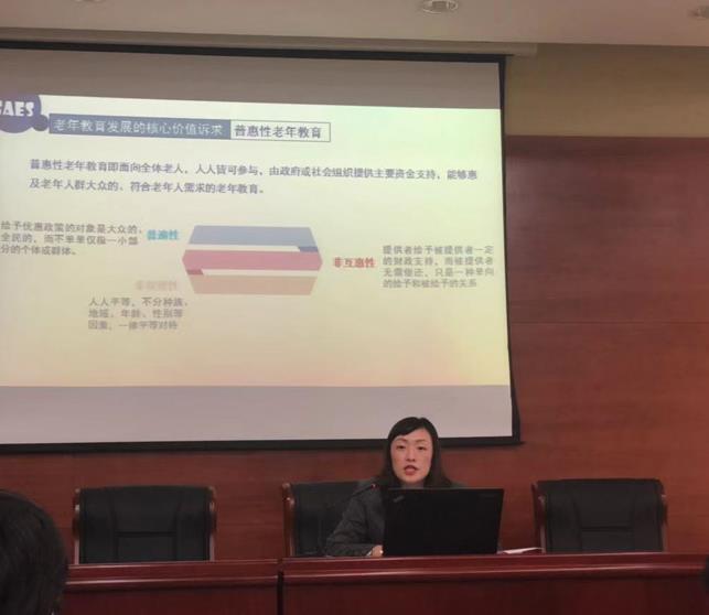 上海市徐汇区社区学院院长杜俭以“‘精准与高效’开启上海老年教育信息化管理与服务时代”为主题,对上海老年教育信息化平台的实施方式、推广模式进行了讲解分享。 上海市教科院职成教所终身教育研究室副主任、副研究员国卉男以普惠性老年教育为主题,阐述了改革开放四十年来我国普惠性老年教育推进的路径与策略。