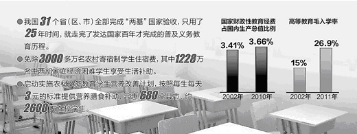 制表:张芳曼 蔡华伟 十六大以来,党和国家高度重视教育,始终把教育放在优先发展的战略地位,采取一系列重大举措推动教育改革发展。 教育是国计,也是民生,寄托着亿万家庭对美好生活的期盼,关系着每一个孩子的前途命运。回眸10年历程,透过一个个耳熟能详的教育“关键词”,人们看到,为办好让人民满意的教育,教育战线和各级政府作出了巨大努力,教育实现了跨越式发展,取得了举世瞩目的成就。 “满意”二字重千钧,落实教育优先发展战略,是国家强盛、民族复兴的必由之路。办好让人民满意的教育,我们仍在路上。 关键词:免费惠及亿万莘莘学子 免费,是一个温暖的字眼。近年来,我国教育领域的“免费”范围不断扩大,从农村孩子“两免一补”到城市孩子免交学费,从免费师范生到免费上中职,“免费”大餐造福亿万学子,令人喜不自禁。 免除义务教育阶段学杂费,对贫困家庭学生免费提供教科书并补助寄宿生生活费,这项深得民心的“两免一补”政策,2005年首先在592个国家重点贫困县实施,2006年扩大到西部农村和部分中部农村地区,2007年春季开学时在全国农村全面实施,惠及1.5亿农村义务教育阶段中小学学生,平均每年每个小学生家庭减负140元,初中生家庭减负180元。 随着国家教育投入不断增加,从2008年秋季学期开始,全面免除城市义务教育阶段学生学杂费。至此,全国真正实现了“免费义务教育”。 从2007年秋季起,国务院决定在教育部直属师范大学实行师范生免费教育。免费师范生在校学习期间免除学费,免缴住宿费,并补助生活费,毕业后确保有编有岗。这项具有重大战略意义的改革举措,旨在鼓励更多优秀青年终身从教。2011年,首届10597名免费师范生毕业后全部到中小学任教,90%以上在中西部。今年,国家将扩大免费师范生计划,鼓励地方实施师范生免费教育。 “免费”效应进一步放大,“免费上中职”开始变为现实。中央有关部门加快中等职业教育免费进程,中等职业教育免学费范围已从农村家庭经济困难学生和涉农专业学生,扩大到城市家庭经济困难学生。 关键词:纲要国家意志,群众关切 2010年7月,党中央、国务院召开新世纪第一次全国教育工作会议,并下发《国家中长期教育改革和发展规划纲要(2010—2020年)》。 这份具有重大战略意义的指导性文件,是在中央直接领导下研究制定的。其制定过程坚持科学民主决策,广开言路、问需于民、问计于民。由500多名专家学者组成11个战略专题组,100多位各领域高层次专家组成咨询组,两次公开向社会征求意见,收集各种意见建议460多万条。动员人力之多、覆盖范围之广、社会参与度之高,是历次制定教育规划纲要所没有的。 教育规划纲要从我国现代化建设总体战略出发,反映了党中央、国务院对未来10年教育改革发展的总体考虑,体现了国家意志,回应了群众关切。专家指出,纲要坚持以人为本,把促进人的全面发展、办好人民满意的教育作为出发点和落脚点,着力解决群众最关切、反映最强烈的问题,体现了中央对推动教育改革发展的规律性认识。 关键词:两基树起一座重要里程碑 上世纪末,我国总体实现了“基本普及九年义务教育、基本扫除青壮年文盲”的奋斗目标。截至2002年,全国还有410个县未实现“两基”,攻坚任务艰巨。这些“最难啃的骨头”多数分布在高寒荒漠地区、边远农牧区和边疆地区,攻坚难度之大,在世界教育史上罕见。 2003年,国务院作出进一步加强农村教育工作的决定,召开了新中国成立以来第一次全国农村教育工作会议,决定实施西部地区“两基”攻坚计划。国家采取了许多重要措施,包括调整农村义务教育管理体制,农村义务教育经费由农民部分承担转为由政府全部承担;加大投入,改善中西部农村中小学办学条件;实施农村义务教育经费保障机制等。 经过9年攻坚,2011年底,中央有关部门最后完成了对西藏、青海、甘肃、四川、云南等省区特别困难的42个县“两基”国检验收。以此为标志全面实现“两基”目标,在我国教育发展史、中华民族发展史上树起一座重要里程碑。 关键词:4%加大投入确保优先发展 从2007年秋季学期开学起,我国进一步建立健全家庭经济困难学生资助政策体系,每年用于助学的财政投入、助学贷款和学校安排的助学经费约达500亿元,让全国1800多所高校约400万名学生和1.5万所中等职业学校约1600万名学生获益。 教育投入不足一直是制约我国教育事业发展的“软肋”。教育规划纲要明确提出,提高国家财政性教育经费支出占国内生产总值的比例,2012年达到4%。今年3月5日,温家宝总理在《政府工作报告》中郑重宣布:中央财政已按全国财政性教育经费支出占国内生产总值的4%编制预算,地方财政要相应安排,确保实现这一目标。 为此,国务院制定加大财政教育投入的意见,出台统一内外资企业和个人教育费附加、全面开征地方教育附加、从土地出让收益中按比例计提教育资金等政策,对落实4%全面部署。 关键词:质量筑牢高等教育“生命线” 1999年起,我国高校扩大招生规模,高等教育进入大众化发展阶段。在快速发展基础上,2005年,党中央、国务院明确提出,今后要把高等教育发展的重点放在提高质量上,适当控制招生增长幅度,相对稳定招生规模,着力培养学生的社会责任感、实践能力和创造精神。 2011年4月,胡锦涛总书记在庆祝清华大学建校100周年大