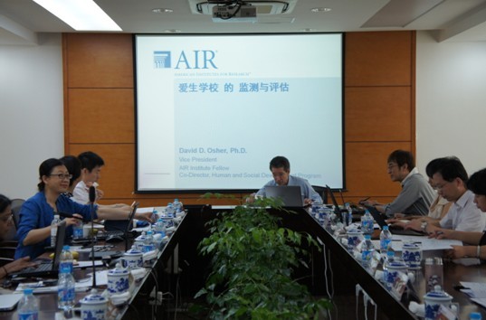 会上,儿基会北京办事处教育官员Lata Monen介绍了爱生学校项目、“爱生学校监测与评估”项目的目的以及对国际、国内专家团队的工作设计;郭晓平女士介绍了爱生学校项目中为改善学生的社会情感学习能力正在制定的项目框架;会议特邀专家美国研究院(American Institutes for Research, AIR)David Osher博士详细介绍了“爱生学校监测与评估”的整体研究设想,以及对“学校爱生程度”进行监测与评估的工具设计和实施设计。针对该项目设计中的一些技术性问题,与会人员进行了交流,在项目产出与项目结果的测量维度、爱生程度分级界定、抽样方法与技术、对照组选择与技术考量等问题上展开了专业探讨,并基本达成共识。