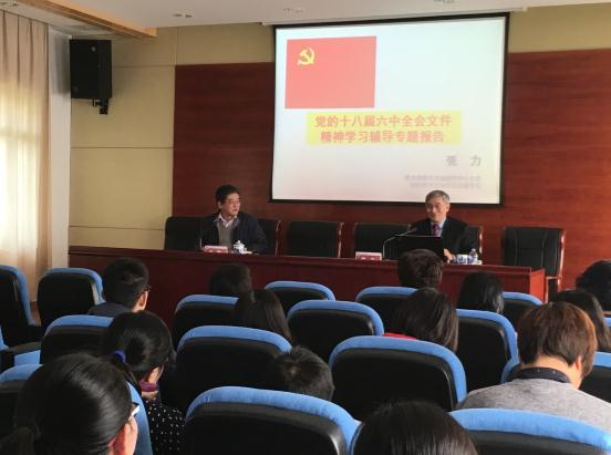 中国共产党第十八届中央委员会第六次全体会议由中央政治局主持。中央委员会总书记习近平作了重要讲话。全会听取和讨论了习近平总书记受中央政治局委托作的工作报告,审议通过了《关于新形势下党内政治生活的若干准则》和《中国共产党党内监督条例》,审议通过了《关于召开党的第十九次全国代表大会的决议》。习近平总书记就《准则(讨论稿)》和《条例(讨论稿)》向全会作了说明。张力教授解读了十八届六中全会公报、党内两个重要法规、习近平总书记讲话精神。张力教授分析了从党的十八大提出全面建成小康社会到十八届六中全会全面从严治党的内在逻辑演变过程,从宏观上解读了十八届六中全会专题研究全面从严治党问题、制定党内政治生活的若干准则、修订《中国共产党党内监督条例(试行)》的新形势新背景,并具体分析了《关于新形势下党内政治生活的若干准则》的重要性及重要内容,《中国共产党党内监督条例》的基本框架、主要内容以及落实执行时需要注意的内容。最后,张主任解读了全会正式提出的一个核心、一个根本遵循、2个加强、坚持4条路线、增强4个自我,坚定4个自信,树立4个意识,6个“不准”,8个“重要”,8个不允许、11个“坚决”。长达两个小时的报告在热烈交流中结束。