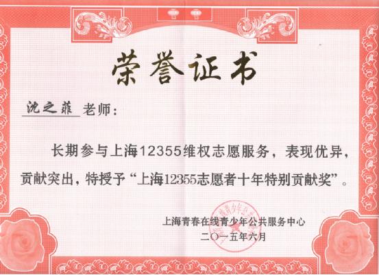 沈之菲同志荣获“上海12355志愿者十年特别贡献奖”